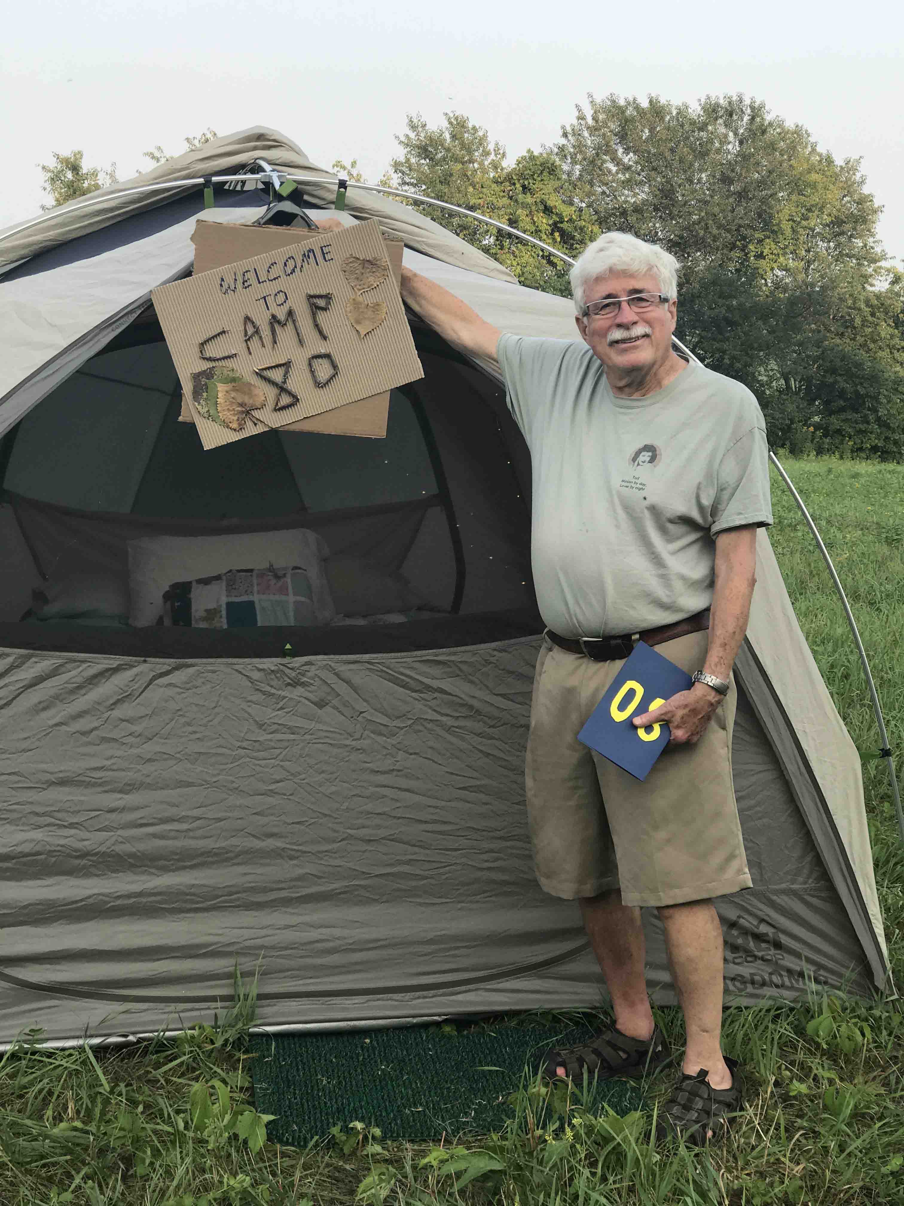 Rounding a wooded corner, we saw our son-in-law tending the campfire. Little motes of burning ash rose and danced skyward. And there, backlit against the sunset, was the tent complete with a Welcome to Camp 80 sign attached to the entry.