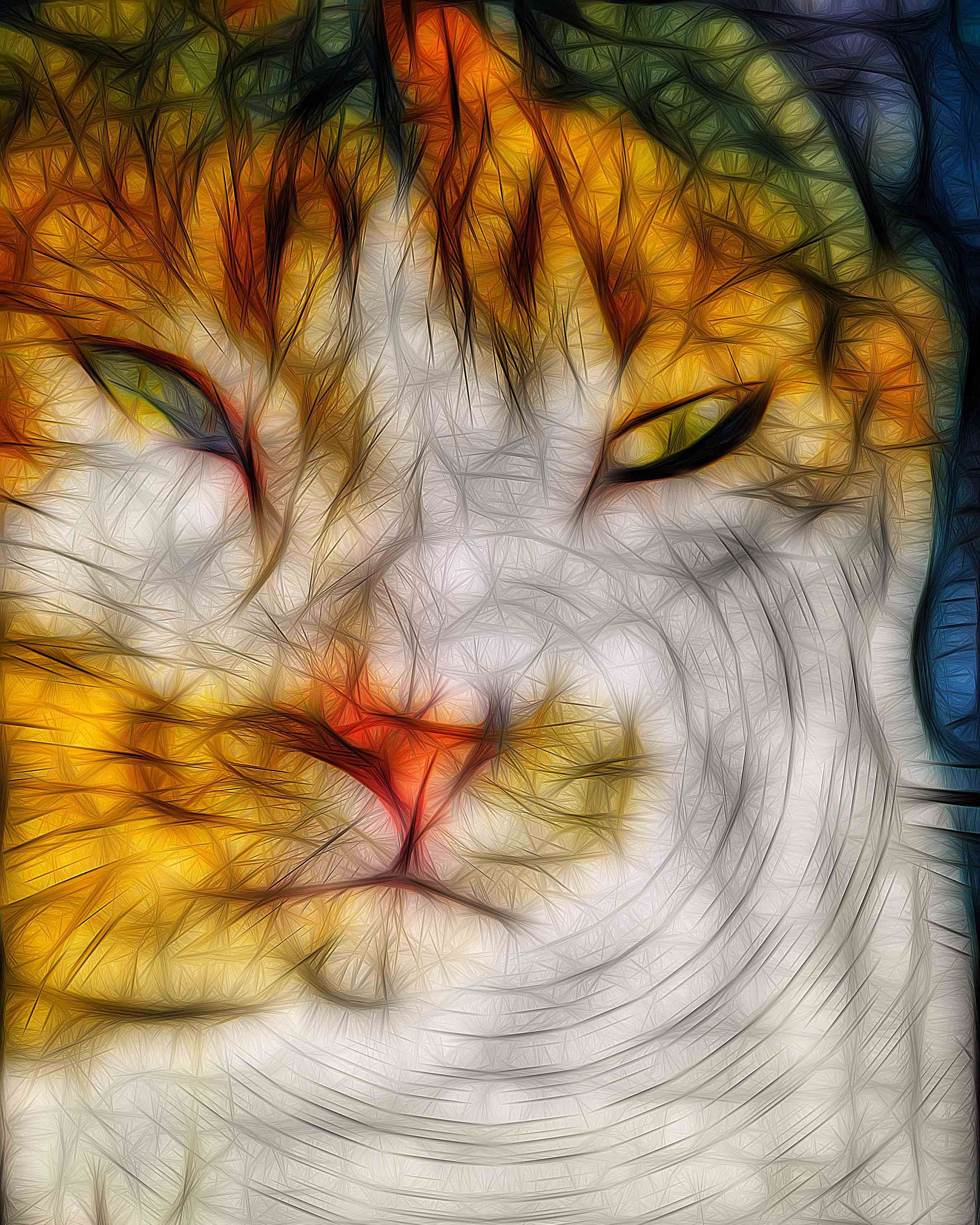 The sound of vomit hitting hardwood woke Pudgy. She blinked owlishly a couple of times and then peered down at Giese and the lava-flow of kibble. To my surprise, she jumped off the desk, sniffed the puke, and then moved the plastic shopping bag on top of the offending mass. The two cats stood for a moment and then walked away as though nothing had happened.