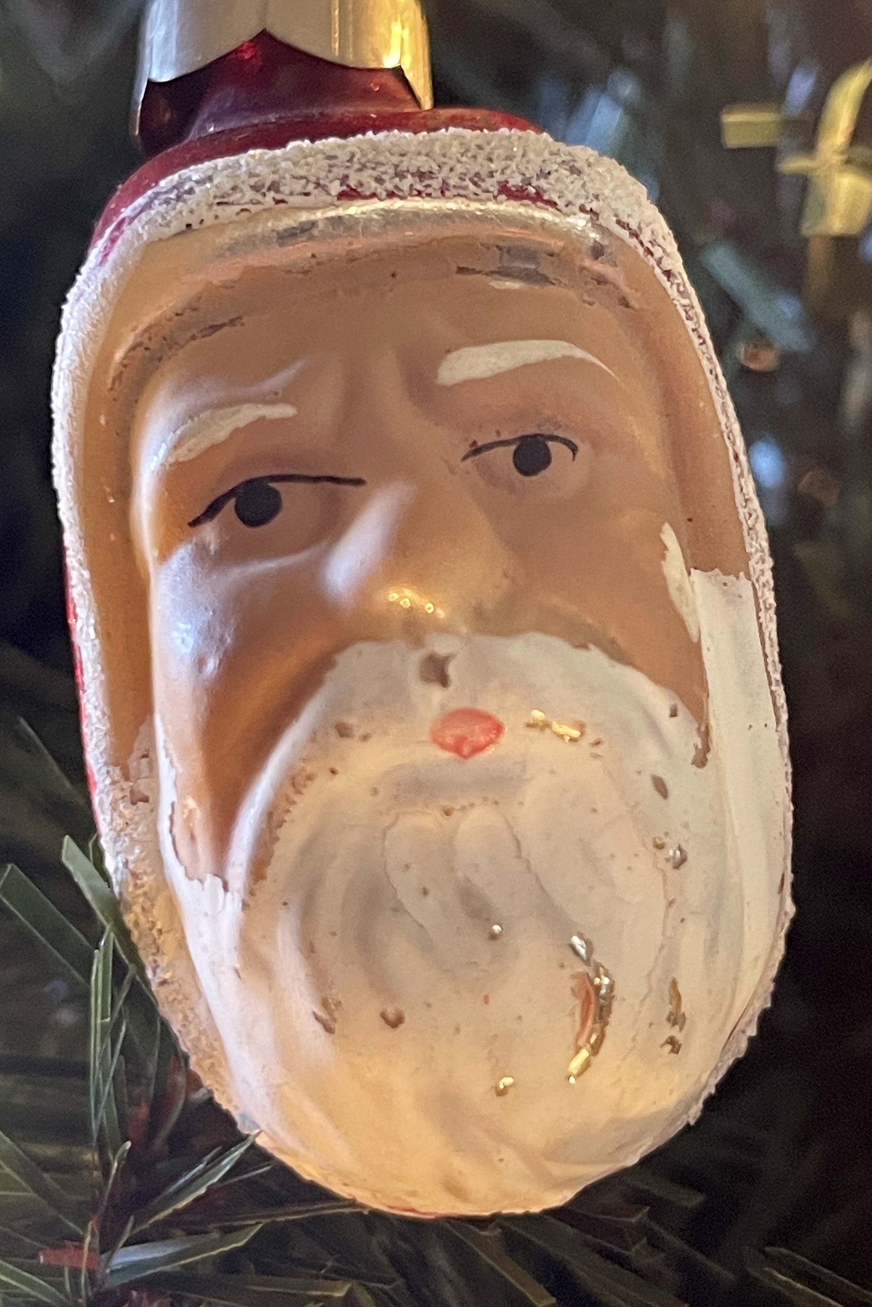 Then there are the inherited ornaments. My husband has a small box of fragile old ornaments from his mother. He has told me his favorite is the one that looks like stained glass, but I like the more-stern-than-jolly Santa Claus. “You’d better be nice,” is written all over his face. Well, that, or he had a few martinis before hitting the toyshop. Hey, this is a no-judgment zone, and it is a big list!