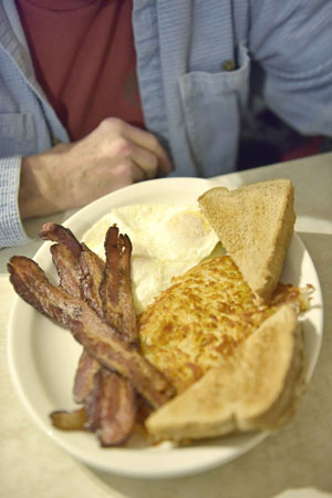 I went for the eggs benedict while my husband took the #1– eggs, bacon, hash browns, and toast. Delicious.