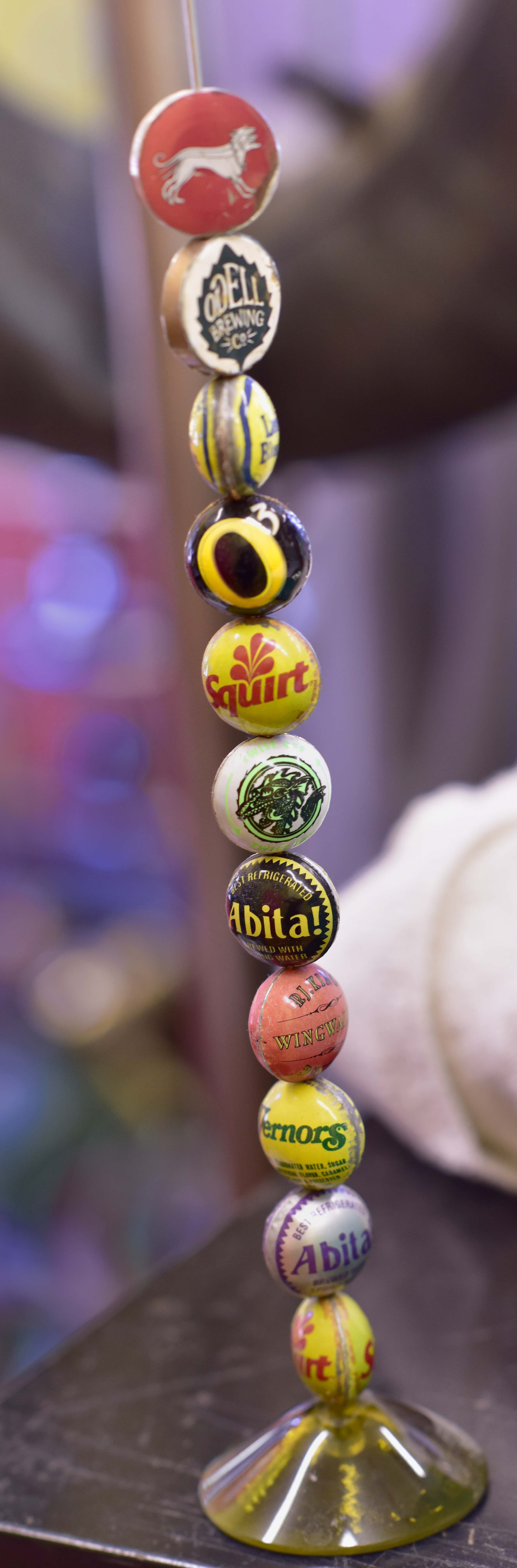 She holds a patent on a device that makes beads out of bottle caps. I was trying to visualize what those would be like in my head, and when I saw them for the first time, I was blown away by how cool they look and feel.