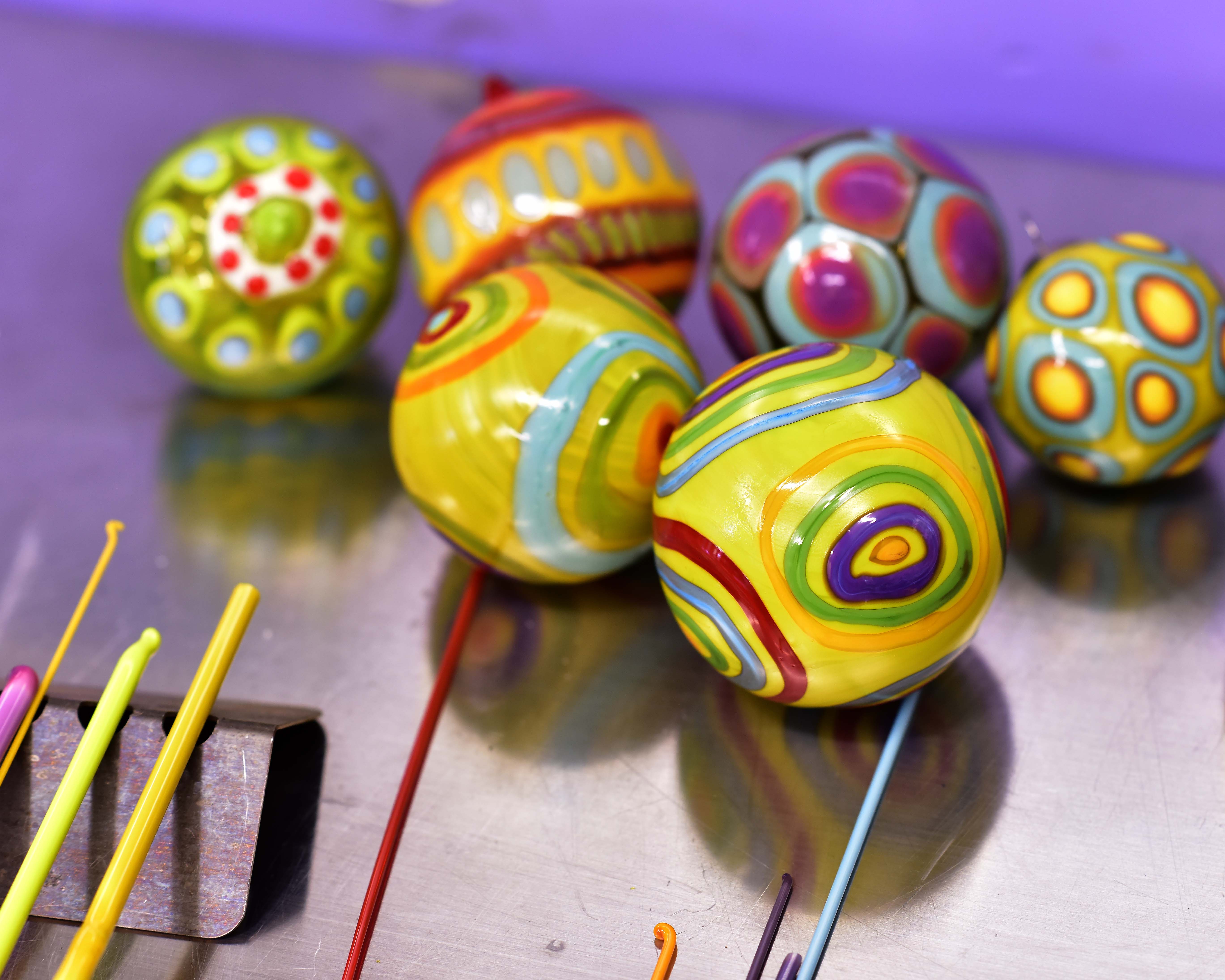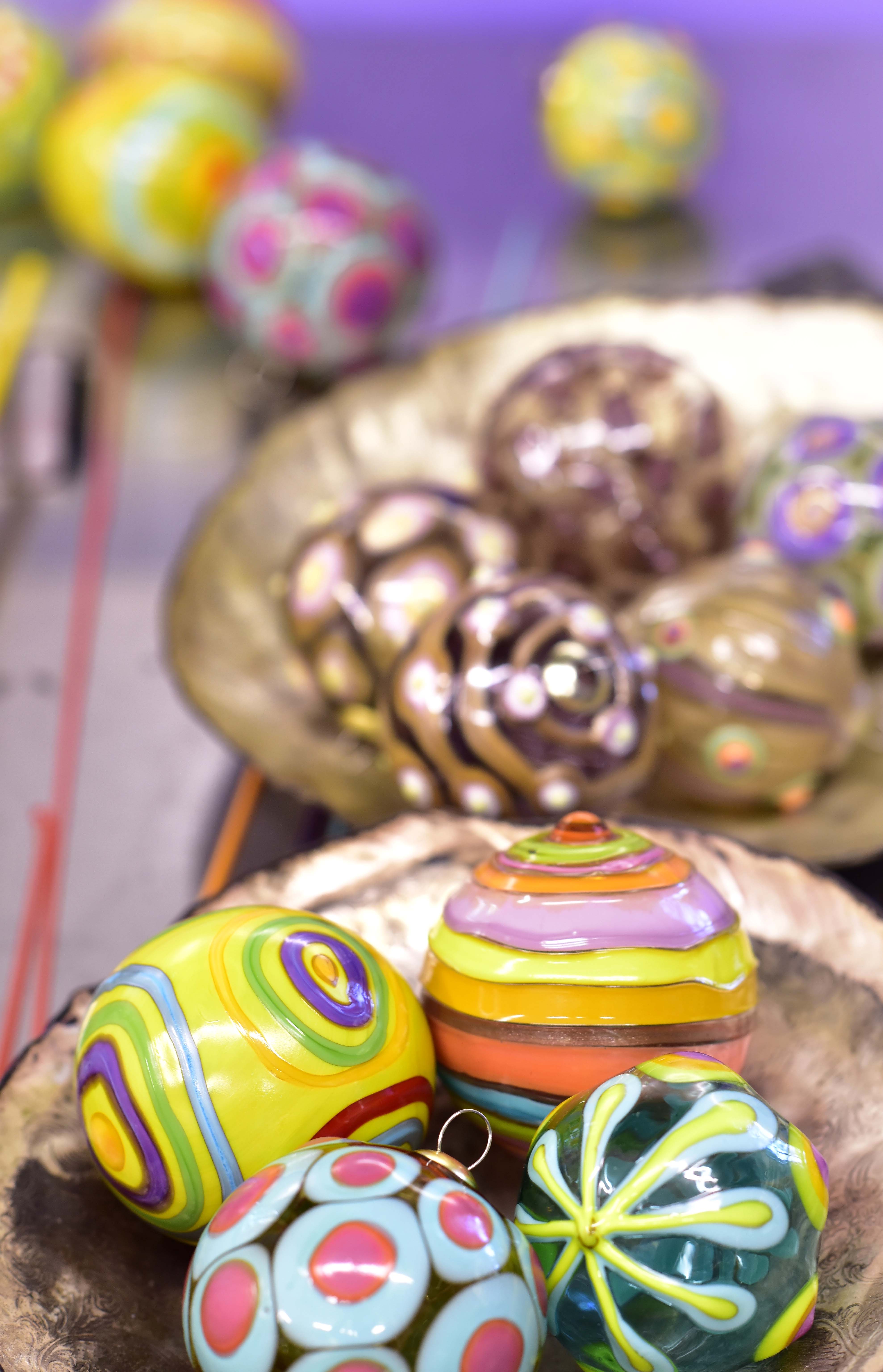 Her current focus is on creating gorgeous torch blown glass ornaments. “People love to collect them,” she says. “And I like the idea that they are an heirloom quality piece of art. I hope they get passed down to the next generation(s).”