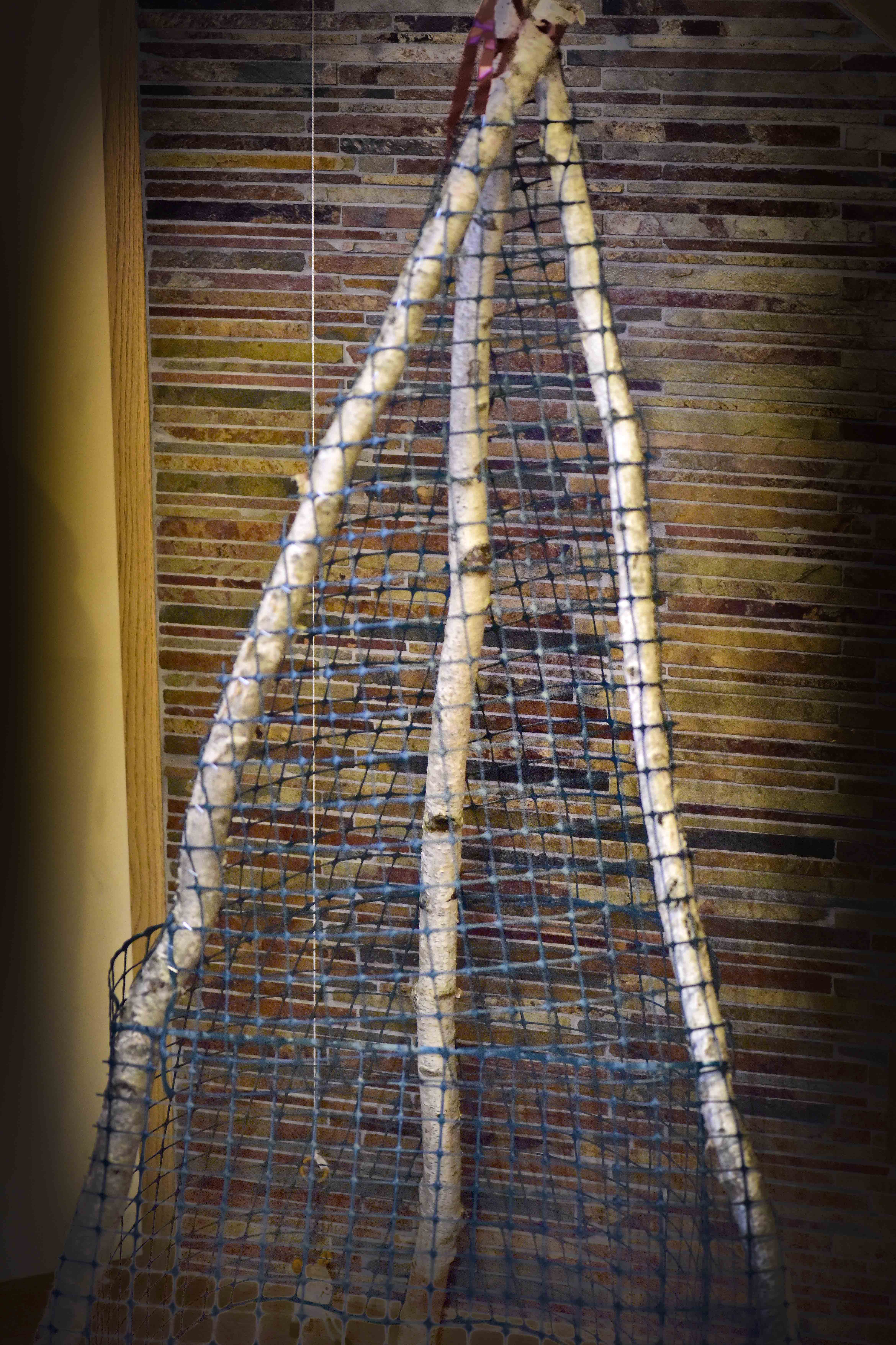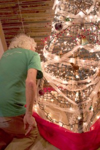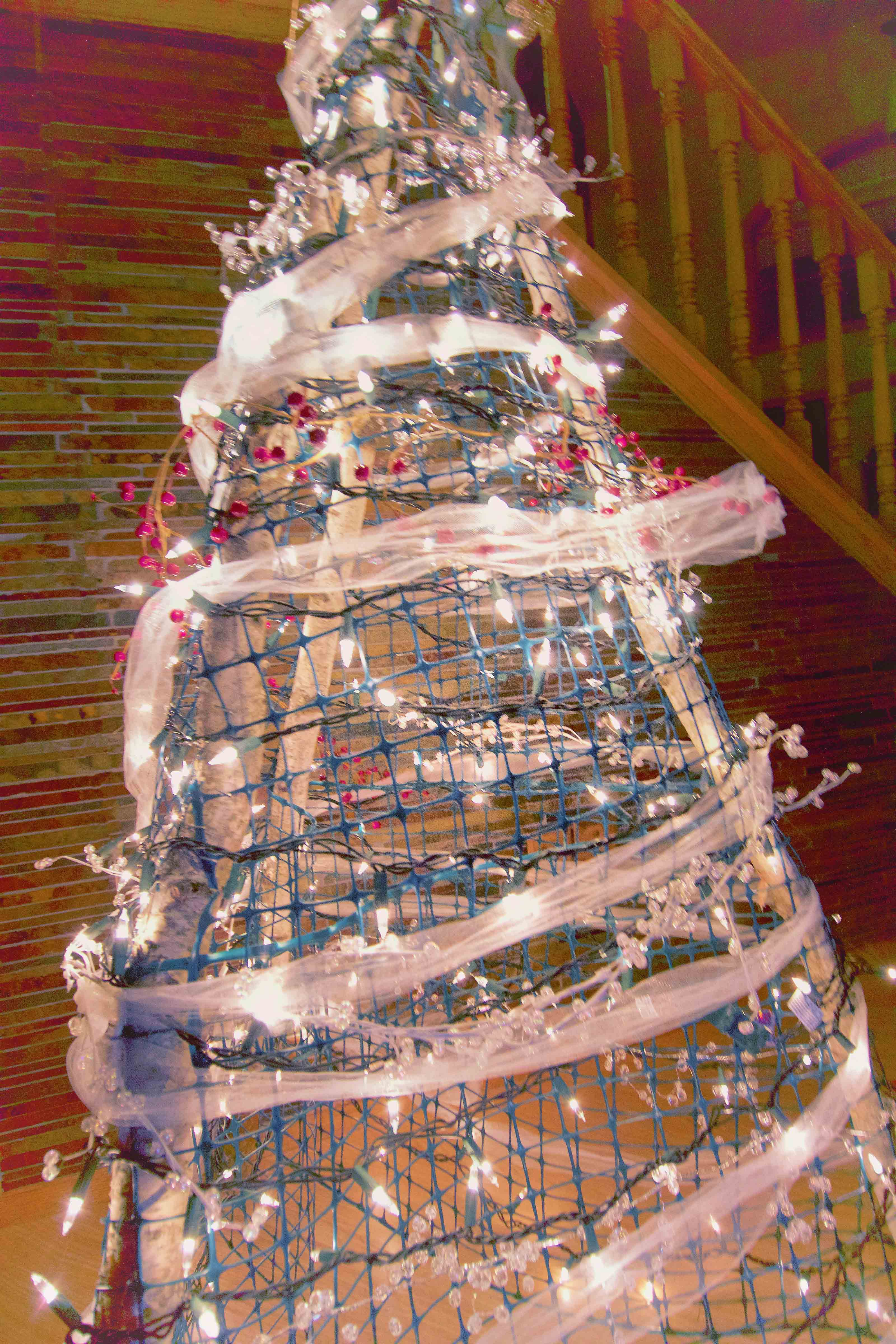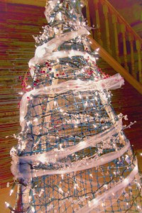 To my surprise, and delight, he had created a Christmas tree. Only slightly Frankenstein-ish in design, I quickly fell in love with its charming quirkiness. The frame of the “tree” consists of three small birch tree trunks that came from my dad’s farm. My husband drilled holes in the top of the trunks and tied them together to form the top of the tree. He then spread the bottom of the trunks to form a tripod of sorts and encircled the frame with green plastic mesh. “I love it!” I said. He visibly gave a sigh of relief.